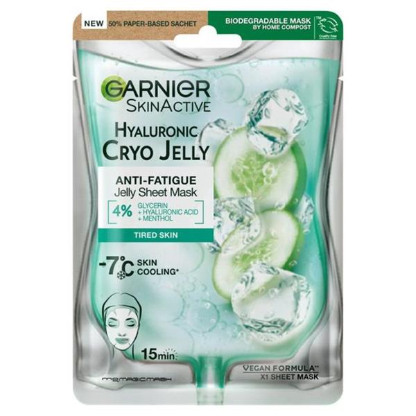 Discover Garnier's NEW Cryo Jelly Anti-Fatigue Jelly Sheet Mask. Discover the power of Cryo Jelly, a second-skin like jelly mask that cools skin’s temperature by -7°C* and instantly minimises signs of fatigue and firms skin by up to +18%. (Instrumental test, 43 subjects, 1H after application).
