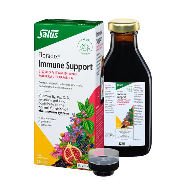 Floradix Immune Support is based on an aqueous herbal extract from selected plants with echinacea and a mixture of fruit juice concentrates, which give it a great fruity taste.