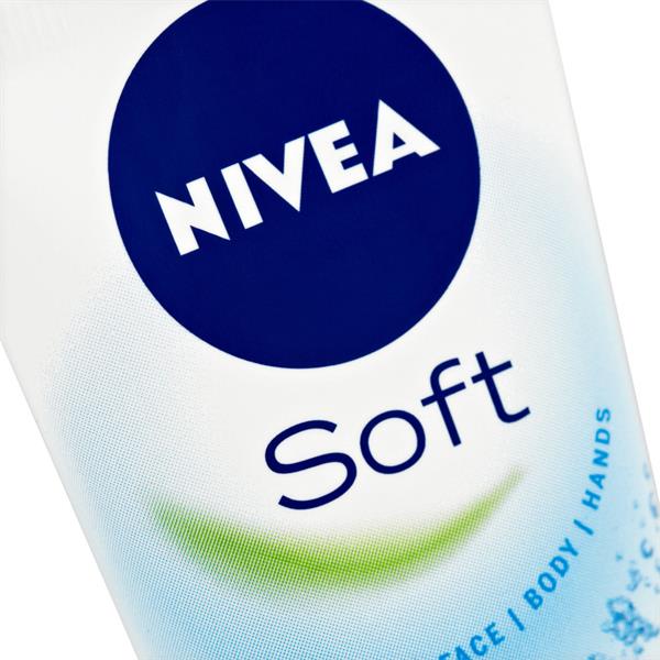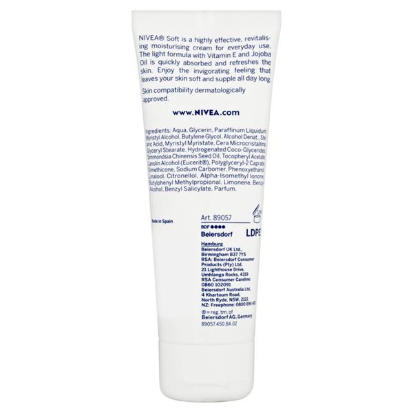 NIVEA Soft is a highly effective moisturising cream, providing an invigorating and refreshing feeling for everyday use. The light formula with Vitamin E & 100% natural Jojoba oil provides 48h hydration for soft skin, with quickly absorption and non-greasy feeling. It now also contains 95% naturally derived ingredients and is completely vegan. Skin compatibility dermatologically approved. Ingredients are from nature retain +50% of their natural state after being processed, including water.