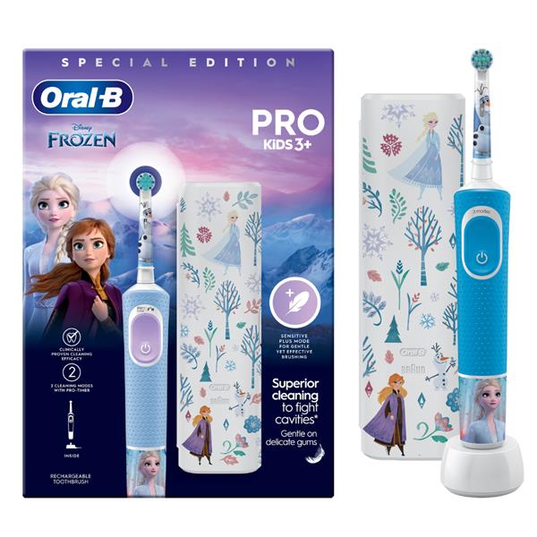 The Oral-B Pro Kids electric toothbrush, recommended by dentists for kids aged 3+, offers gentle and effective cleaning. With 2 brushing modes including a unique, kid-friendly sensitive mode, this brush gently cleans kids' teeth. It removes more plaque than a regular manual toothbrush. It includes 4 themed stickers are included to customise the handle.