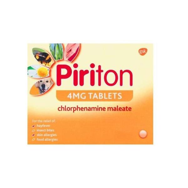 Piriton 4mg tablets Chlorphenamine Maleate which relieves hayfever, irrritation from insect bites, skin and food allergies.